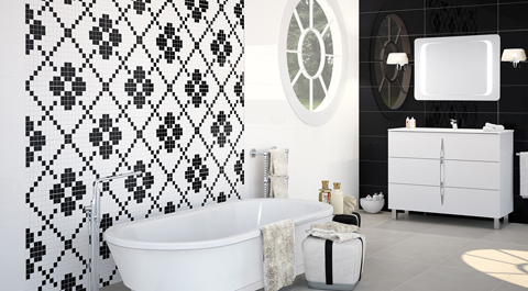 Los revestimientos más sofisticados llegan con la colección Baqueira, una cerámica en brillo cuya gama de texturas permite crear originales mosaicos que, con sus juegos de sombras, rompen la monocromía. Dispone de una versión completamente plana, una segunda con bisel y dos más arriesgadas, con dibujo de líneas y ondas. Si se busca un toque de originalidad pero sin caer en exageraciones, esta colección se complementa con mallas duotono (blanco/negro) o blancas que potencian el diseño del baño.