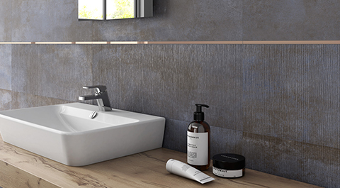 Asimismo, las opciones decorativas de esta serie se completan con la introducción de dos listelos en tonos cobre (1 x 90,2 cm) y acero (1,5 x 90,2 cm) que permiten crear multitud de composiciones ornamentales y que introducen una combinación de éxito: la sofisticación del metalizado como complemento del acabado desgastado e industrial de Ferrum.