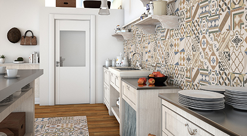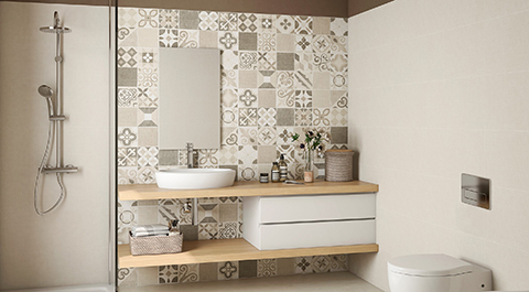 Bari, la serie más próxima al hidráulico tradicional de Gala, ofrece una llamativa combinación de motivos florales y geométricos, disponible en diseño multicolor o en tonalidades beige. Las piezas se presentan en una combinación aleatoria de diseños que permiten crear composiciones únicas y diferentes tanto para suelo (45 x 45 cm) como para revestimiento de pared (31 x 61 cm).