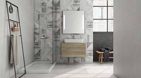 Por su parte, Fortis Decor juega con las composiciones geométricas en formato bicolor (disponible en blanco-azul, gris perla y arena), al tiempo que aprovecha la belleza natural de la piedra en un acabado que reproduce con gran realismo la porosidad de este material. Fabricada en revestimiento de pasta blanca, esta serie solamente es apta para pared y viene en tamaño 25 x 70 cm.